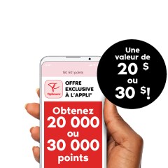 En magasin seulementÉvénement de points surpriseObtenez 20 000 ou 30 000 points à l’achat de 60 $ ou plus de presque tous produits*. Une valeur de 20 ou 30 $! Jusqu’au 14 mars. Obtenir une offre
